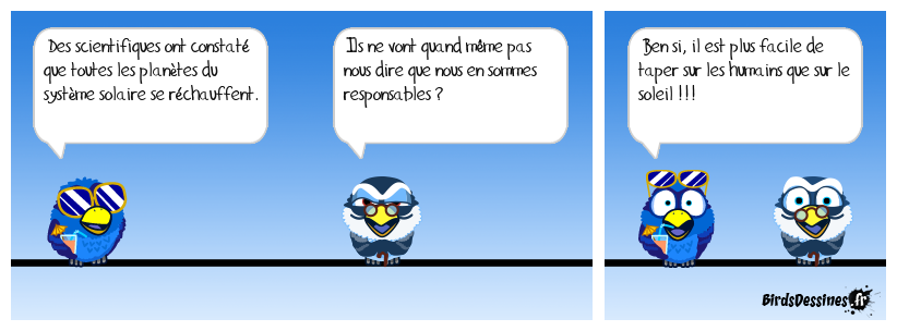 Case 1:Bird 1: Des scientifiques ont constaté que toutes les planètes du système solaire se réchauffent. | Case 2: Bird 1: Ils ne vont quand même pas nous dire que nous en sommes responsables ? | Case 3: Bird 1: Ben si, il est plus facile de taper sur les humains que sur le soleil !!!