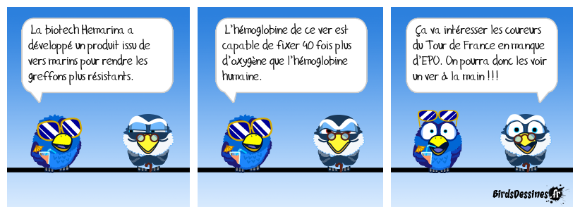 Case 1:Bird 1: La biotech Hemarina a développé un produit issu de vers marins pour rendre les greffons plus résistants. | Case 2: Bird 1: L’hémoglobine de ce ver est capable de fixer 40 fois plus d’oxygène que l’hémoglobine humaine. | Case 3: Bird 1: Ça va intéresser les coureurs du Tour de France en manque d’EPO. On pourra donc les voir un ver à la main !!!
