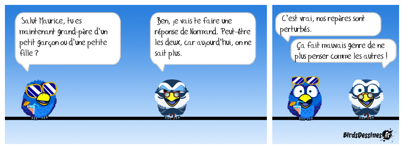 Case 1:Bird 1: Salut Maurice, tu es maintenant grand-père d’un petit garçon ou d’une petite fille ? | Case 2: Bird 1: Ben, je vais te faire une réponse de Normand. Peut-être les deux, car aujourd’hui, on ne sait plus. | Case 3: Bird 1: C’est vrai, nos repères sont perturbés. Bird 2: Ça fait mauvais genre de ne plus penser comme les autres !