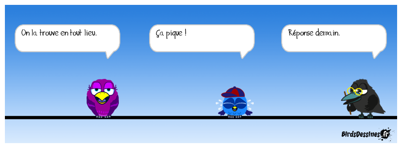 Case 1:Bird 1: On la trouve en tout lieu. | Case 2: Bird 1: Ça pique ! | Case 3: Bird 1: Réponse demain.