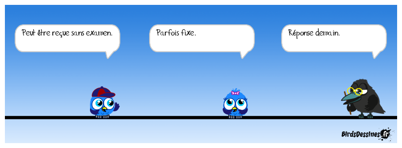 Case 1:Bird 1: Peut être reçue sans examen. | Case 2: Bird 1: Parfois fixe. | Case 3: Bird 1: Réponse demain.
