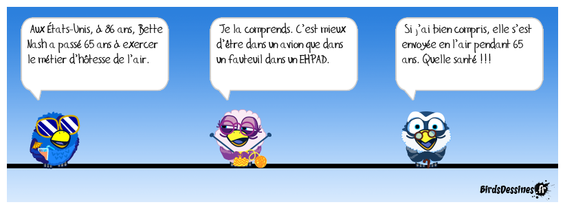 Case 1:Bird 1: Aux Ètats-Unis, à 86 ans, Bette Nash a passé 65 ans à exercer le métier d’hôtesse de l’air. | Case 2: Bird 1: Je la comprends. C’est mieux d’être dans un avion que dans un fauteuil dans un EHPAD. | Case 3: Bird 1: Si j’ai bien compris, elle s’est envoyée en l’air pendant 65 ans. Quelle santé !!!