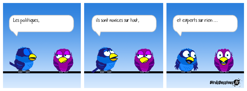 Case 1:Bird 1: Les politiques, | Case 2: Bird 1: ils sont novices sur tout, | Case 3: Bird 1: et experts sur rien ...