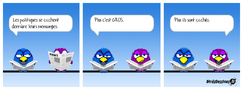 Case 1:Bird 1: Les politiques se cachent derrière leurs mensonges. | Case 2: Bird 1: Plus c'est GROS. | Case 3: Bird 1: Plus ils sont cachés.