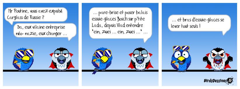 Case 1:Bird 1: Mr Poutine, vous avez expulsé Carglass de Russie ?Bird 2: Da, eux vilaine entreprise néo- nazie, eux changer ... | Case 2: Bird 1: ... pare-brise et poser balais essuie-glaces Bosch sur p'tite Lada, depuis Vlad entendre "ein, zwei ... ein, zwei ..." ... | Case 3: Bird 1: ... et bras d'essuie-glaces se lever tout seuls !
