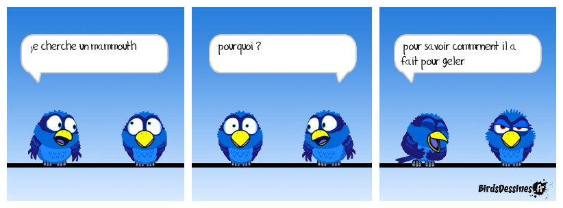 Case 1:Bird 1: je cherche un mammouth | Case 2: Bird 1: pourquoi ? | Case 3: Bird 1: pour savoir commrnent il a fait pour geler