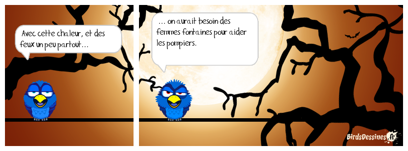 Case 1:Bird 1: Avec cette chaleur, et des feux un peu partout... | Case 2: Bird 1: ... on aurait besoin des femmes fontaines pour aider les pompiers. | Case 3: