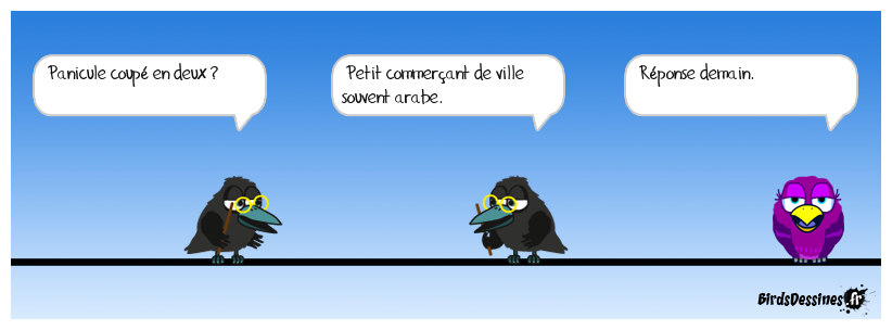 Case 1:Bird 1: Panicule coupé en deux ? | Case 2: Bird 1: Petit commerçant de ville souvent arabe. | Case 3: Bird 1: Réponse demain.