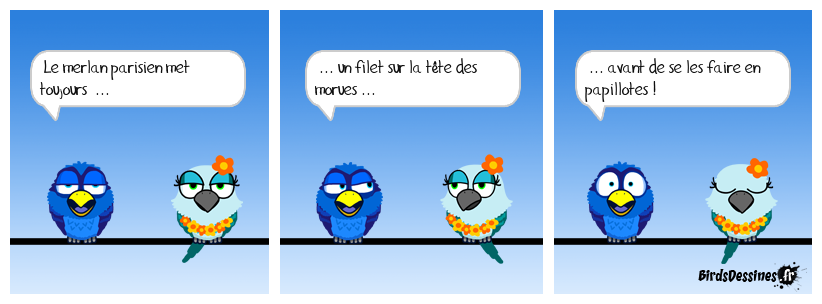 Case 1:Bird 1: Le merlan parisien met toujours ... | Case 2: Bird 1: ... un filet sur la tête des morues ... | Case 3: Bird 1: ... avant de se les faire en papillotes !
