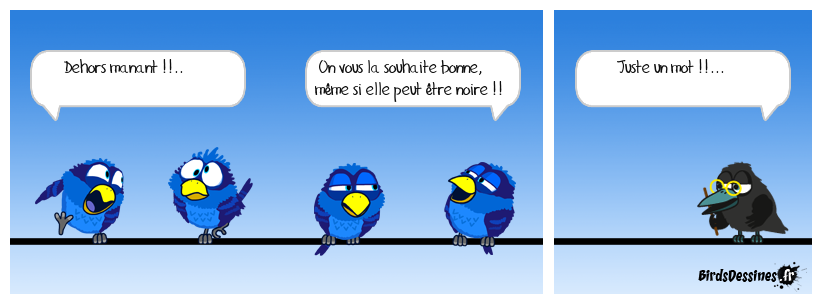Case 1:Bird 1: Dehors manant !!.. | Case 2: Bird 1: On vous la souhaite bonne, même si elle peut être noire !! | Case 3: Bird 1: Juste un mot !!...