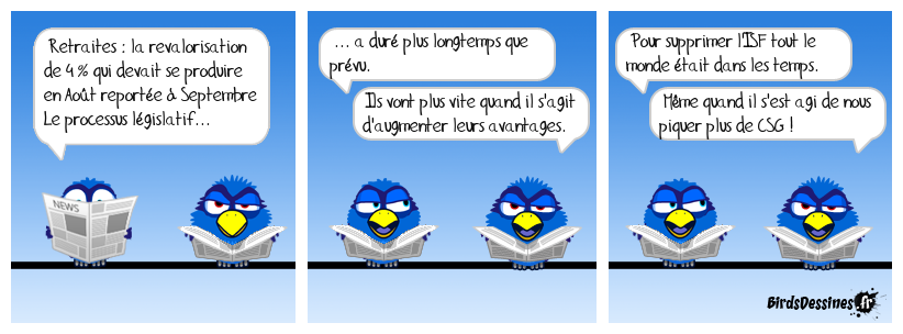 Case 1:Bird 1: Retraites : la revalorisation de 4 % qui devait se produire en Août reportée à Septembre Le processus législatif... | Case 2: Bird 1: ... a duré plus longtemps que prévu. Bird 2: Ils vont plus vite quand il s'agit d'augmenter leurs avantages. | Case 3: Bird 1: Pour supprimer l'ISF tout le monde était dans les temps. Bird 2: Même quand il s'est agi de nous piquer plus de CSG !