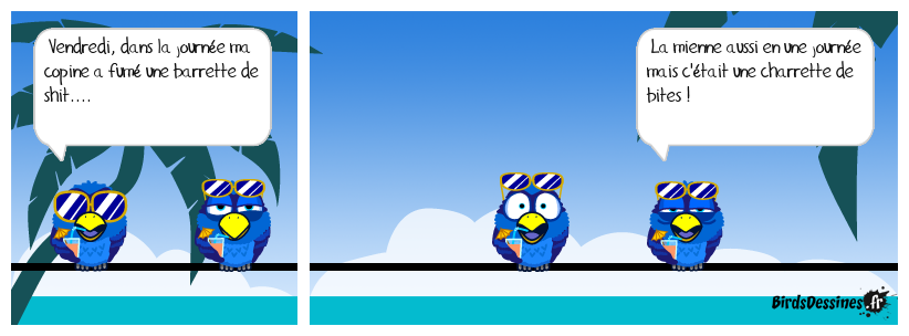 Case 1:Bird 1: Vendredi, dans la journée ma copine a fumé une barrette de shit.... | Case 2: | Case 3: Bird 1: La mienne aussi en une journée mais c'était une charrette de bites !