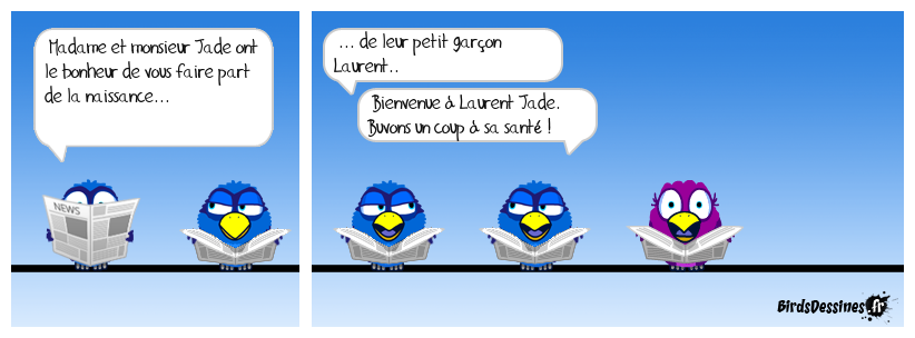 Case 1:Bird 1: Madame et monsieur Jade ont le bonheur de vous faire part de la naissance... | Case 2: Bird 1: ... de leur petit garçon Laurent.. Bird 2: Bienvenue à Laurent Jade. Buvons un coup à sa santé ! | Case 3:
