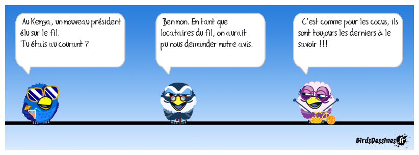 Case 1:Bird 1: Au Kenya, un nouveau président élu sur le fil. Tu étais au courant ? | Case 2: Bird 1: Ben non. En tant que locataires du fil, on aurait pu nous demander notre avis. | Case 3: Bird 1: C’est comme pour les cocus, ils sont toujours les derniers à le savoir !!!