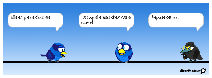 Case 1:Bird 1: Elle est pleine d'énergie. | Case 2: Bird 1: Du coup elle vient chez vous en courant. | Case 3: Bird 1: Réponse demain.