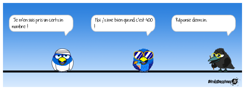 Case 1:Bird 1: Je m'en suis pris un certain nombre ! | Case 2: Bird 1: Moi j'aime bien quand c'est 400 ! | Case 3: Bird 1: Réponse demain.