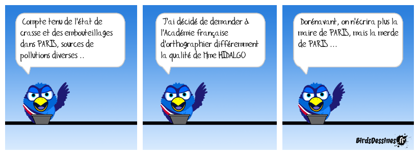 Case 1:Bird 1: Compte tenu de l'état de crasse et des embouteillages dans PARIS, sources de pollutions diverses .. | Case 2: Bird 1: J'ai décidé de demander à l'Académie française d'orthographier différemment la qualité de Mme HIDALGO | Case 3: Bird 1: Dorénavant, on n'écrira plus la maire de PARIS, mais la merde de PARIS ...