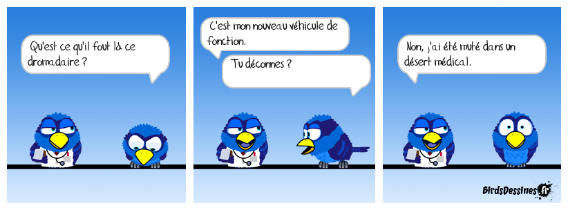 Case 1:Bird 1: Qu'est ce qu'il fout là ce dromadaire ? | Case 2: Bird 1: C'est mon nouveau véhicule de fonction. Bird 2: Tu déconnes ? | Case 3: Bird 1: Non, j'ai été muté dans un désert médical.