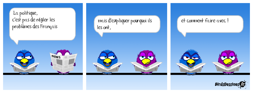 Case 1:Bird 1: La politique, c'est pas de régler les problèmes des Français | Case 2: Bird 1: mais d'expliquer pourquoi ils les ont, | Case 3: Bird 1: et comment faire avec !
