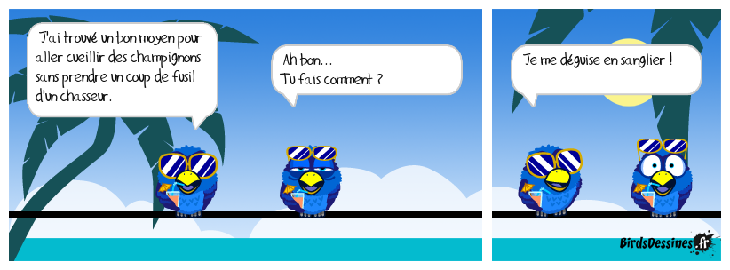 Case 1:Bird 1: J'ai trouvé un bon moyen pour aller cueillir des champignons sans prendre un coup de fusil d'un chasseur. | Case 2: Bird 1: Ah bon... Tu fais comment ? | Case 3: Bird 1: Je me déguise en sanglier !