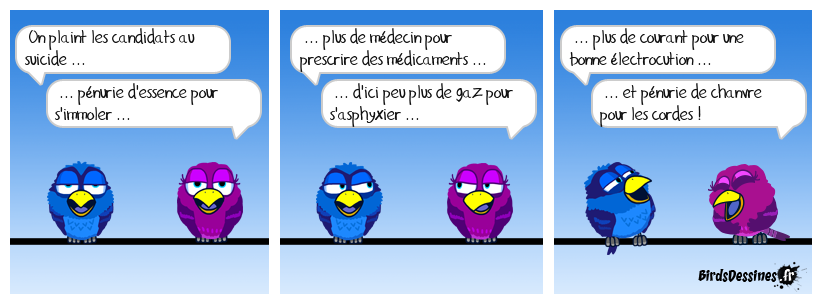 Case 1:Bird 1: On plaint les candidats au suicide ...Bird 2: ... pénurie d'essence pour s'immoler ... | Case 2: Bird 1: ... plus de médecin pour prescrire des médicaments ... Bird 2: ... d'ici peu plus de gaz pour s'asphyxier ... | Case 3: Bird 1: ... plus de courant pour une bonne électrocution ... Bird 2: ... et pénurie de chanvre pour les cordes !