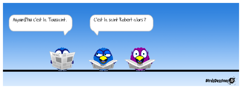 Case 1:Bird 1: Aujourd'hui c'est la Toussaint. | Case 2: Bird 1: C'est la saint Robert alors ? | Case 3: