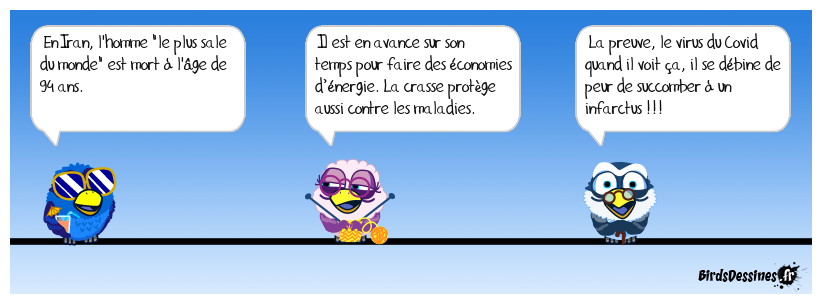 Case 1:Bird 1: En Iran, l'homme "le plus sale du monde" est mort à l'âge de 94 ans. | Case 2: Bird 1: Il est en avance sur son temps pour faire des économies d’énergie. La crasse protège aussi contre les maladies. | Case 3: Bird 1: La preuve, le virus du Covid quand il voit ça, il se débine de peur de succomber à un infarctus !!!