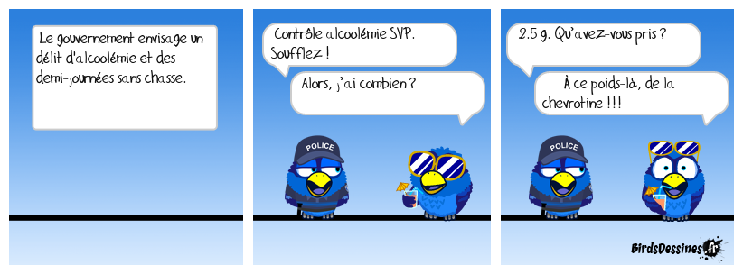 Case 1:Bird 1: Le gouvernement envisage un délit d'alcoolémie et des demi-journées sans chasse. | Case 2: Bird 1: Contrôle alcoolémie SVP. Soufflez ! Bird 2: Alors, j’ai combien ? | Case 3: Bird 1: 2.5 g. Qu’avez-vous pris ? Bird 2: À ce poids-là, de la chevrotine !!!