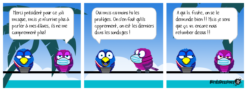 Case 1:Bird 1: Merci président pour ce joli masque, mais je n'arrive plus à parler à mes élèves, ils ne me comprennent plus! | Case 2: Bird 1: Oui mais au moins tu les protèges. On s'en fout qu'ils apprennent, on est les derniers dans les sondages ! | Case 3: Bird 1: A qui la faute, on se le demande bien !! Mais je sens que ça va encore nous retomber dessus !!
