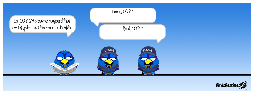 Case 1:Bird 1: La COP 27 s'ouvre aujourd'hui en Ègypte, à Charm el-Cheikh. | Case 2: Bird 1: ... Good COP ? Bird 2: ... Bad COP ? | Case 3: