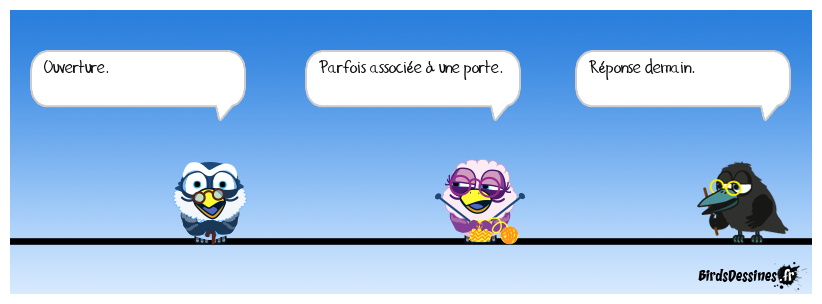 Case 1:Bird 1: Ouverture. | Case 2: Bird 1: Parfois associée à une porte. | Case 3: Bird 1: Réponse demain.