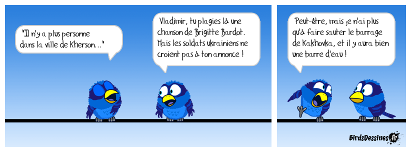 Case 1:Bird 1: "Il n'y a plus personne dans la ville de Kherson..." | Case 2: Bird 1: Vladimir, tu plagies là une chanson de Brigitte Bardot. Mais les soldats ukrainiens ne croient pas à ton annonce ! | Case 3: Bird 1: Peut-être, mais je n'ai plus qu'à faire sauter le barrage de Kakhovka, et il y aura bien une barre d'eau !