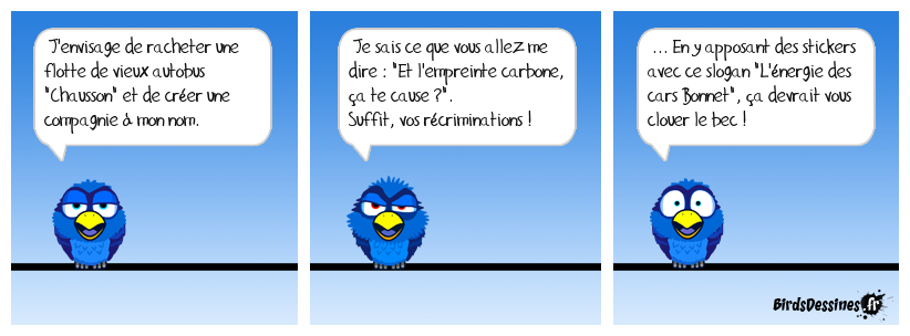 Case 1:Bird 1: J'envisage de racheter une flotte de vieux autobus "Chausson" et de créer une compagnie à mon nom. | Case 2: Bird 1: Je sais ce que vous allez me dire : "Et l'empreinte carbone, ça te cause ?". Suffit, vos récriminations ! | Case 3: Bird 1: ... En y apposant des stickers avec ce slogan "L'énergie des cars Bonnet", ça devrait vous clouer le bec !