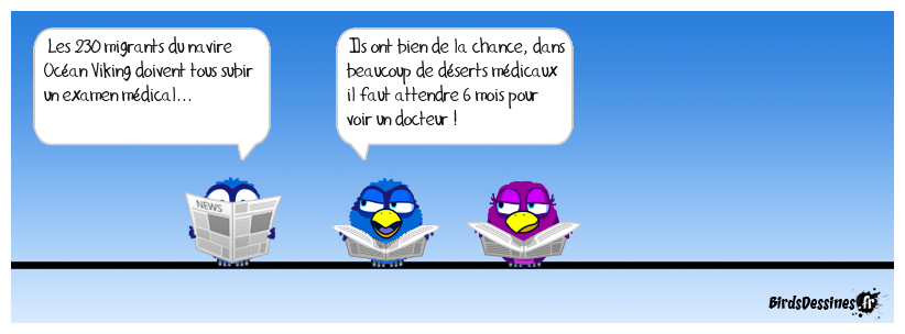 Case 1:Bird 1: Les 230 migrants du navire Océan Viking doivent tous subir un examen médical... | Case 2: Bird 1: Ils ont bien de la chance, dans beaucoup de déserts médicaux il faut attendre 6 mois pour voir un docteur ! | Case 3: