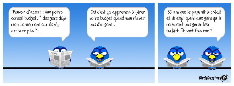 Case 1:Bird 1: Pouvoir d’achat : Aux points conseil budget, « des gens déjà ric-rac viennent car ils n’y arrivent plus »... | Case 2: Bird 1: Oui c'est ça apprenez à gérer votre budget quand vous n'avez pas d'argent.. | Case 3: Bird 1: 50 ans que le pays vit à crédit et ils expliquent aux gens qu'ils ne savent pas gérer leur budget. Ils sont fous non ?