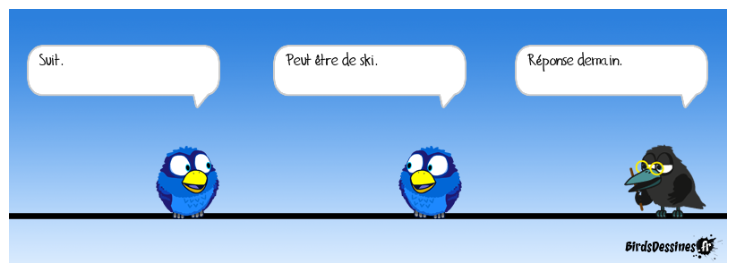 Case 1:Bird 1: Suit. | Case 2: Bird 1: Peut être de ski. | Case 3: Bird 1: Réponse demain.