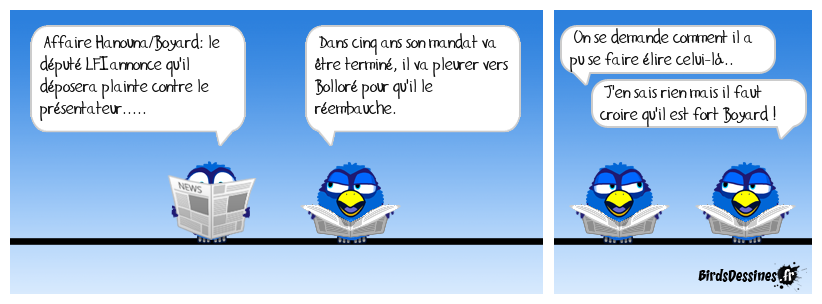 Case 1:Bird 1: Affaire Hanouna/Boyard: le député LFI annonce qu'il déposera plainte contre le présentateur..... | Case 2: Bird 1: Dans cinq ans son mandat va être terminé, il va pleurer vers Bolloré pour qu'il le réembauche. | Case 3: Bird 1: On se demande comment il a pu se faire élire celui-là.. Bird 2: J'en sais rien mais il faut croire qu'il est fort Boyard !