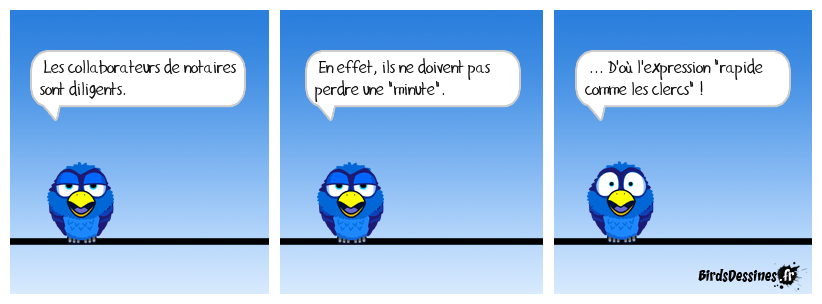 Case 1:Bird 1: Les collaborateurs de notaires sont diligents. | Case 2: Bird 1: En effet, ils ne doivent pas perdre une "minute". | Case 3: Bird 1: ... D'où l'expression "rapide comme les clercs" !