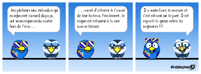Case 1:Bird 1: Des pêcheurs néo-zélandais qui naviguaient au nord du pays, ont vu un requin mako sauter hors de l’eau .... | Case 2: Bird 1: .....avant d’atterrir à l’avant de leur bateau. Finalement, le requin est retourné à la mer sans se blesser. | Case 3: Bird 1: Il a voulu faire le mariole et s’est rétamé sur le pont. Il est reparti la queue entre les nageoires !!!