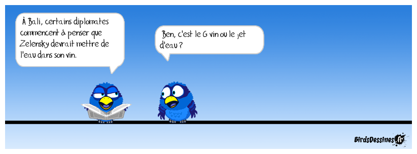 Case 1:Bird 1: À Bali, certains diplomates commencent à penser que Zelensky devrait mettre de l'eau dans son vin. | Case 2: Bird 1: Ben, c'est le G vin ou le jet d'eau ? | Case 3: