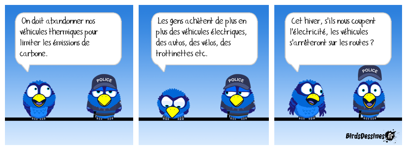 Case 1:Bird 1: On doit abandonner nos véhicules thermiques pour limiter les émissions de carbone. | Case 2: Bird 1: Les gens achètent de plus en plus des véhicules électriques, des autos, des vélos, des trottinettes etc. | Case 3: Bird 1: Cet hiver, s'ils nous coupent l'électricité, les véhicules s'arrêteront sur les routes ?
