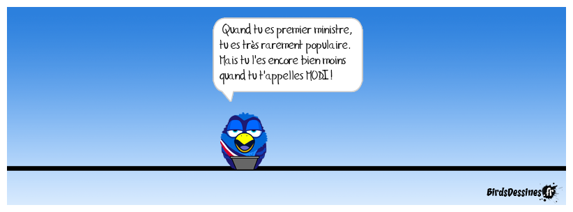 Case 1: | Case 2: Bird 1: Quand tu es premier ministre, tu es très rarement populaire. Mais tu l'es encore bien moins quand tu t'appelles MODI ! | Case 3: