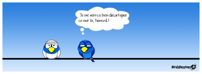Case 1: | Case 2: Bird 1: Je me verrais bien décortiquer ce mot là, homard ! | Case 3: