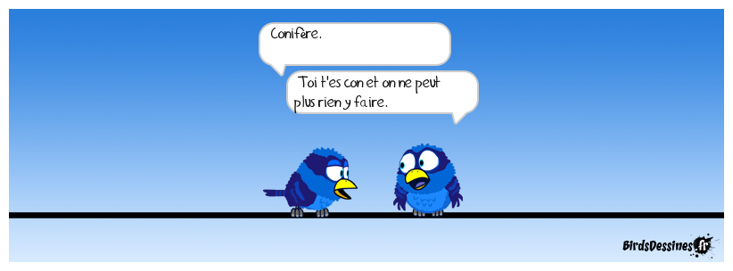 Case 1: | Case 2: Bird 1: Conifère. Bird 2: Toi t'es con et on ne peut plus rien y faire. | Case 3: