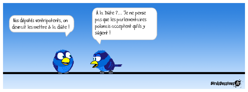 Case 1:Bird 1: Nos députés ventripotents, on devrait les mettre à la diète ! | Case 2: Bird 1: À la Diète ?... Je ne pense pas que les parlementaires polonais acceptent qu'ils y siègent ! | Case 3: