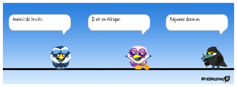 Case 1:Bird 1: Animal de traits. | Case 2: Bird 1: Il vit en Afrique. | Case 3: Bird 1: Réponse demain.