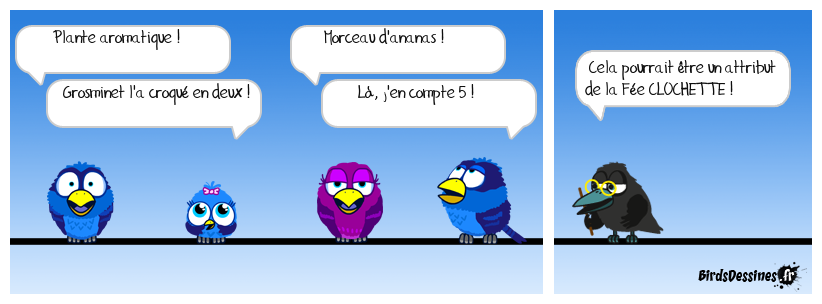 Case 1:Bird 1: Plante aromatique !Bird 2: Grosminet l'a croqué en deux ! | Case 2: Bird 1: Morceau d'ananas ! Bird 2: Là, j'en compte 5 ! | Case 3: Bird 1: Cela pourrait être un attribut de la Fée CLOCHETTE !