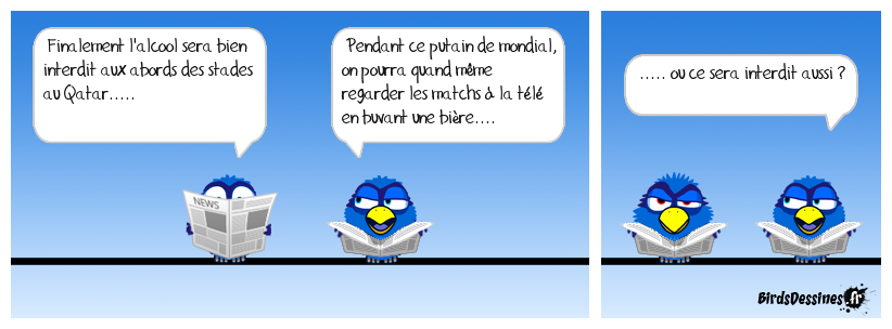 Case 1:Bird 1: Finalement l'alcool sera bien interdit aux abords des stades au Qatar..... | Case 2: Bird 1: Pendant ce putain de mondial, on pourra quand même regarder les matchs à la télé en buvant une bière.... | Case 3: Bird 1: ..... ou ce sera interdit aussi ?