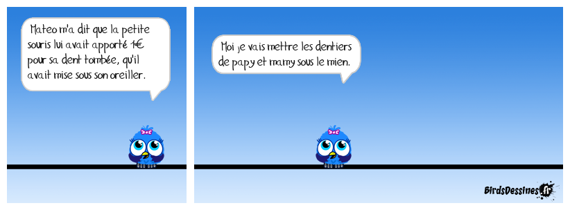 Case 1:Bird 1: Mateo m'a dit que la petite souris lui avait apporté 1€ pour sa dent tombée, qu'il avait mise sous son oreiller. | Case 2: Bird 1: Moi je vais mettre les dentiers de papy et mamy sous le mien. | Case 3: