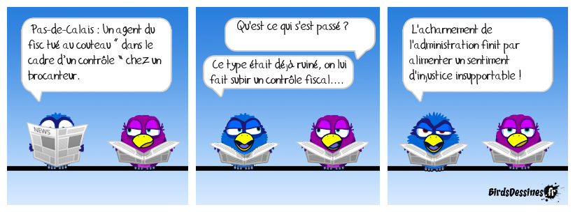 Case 1:Bird 1: Pas-de-Calais : Un agent du fisc tué au couteau « dans le cadre d’un contrôle » chez un brocanteur. | Case 2: Bird 1: Qu'est ce qui s'est passé ? Bird 2: Ce type était déjà ruiné, on lui fait subir un contrôle fiscal.... | Case 3: Bird 1: L'acharnement de l'administration finit par alimenter un sentiment d'injustice insupportable !